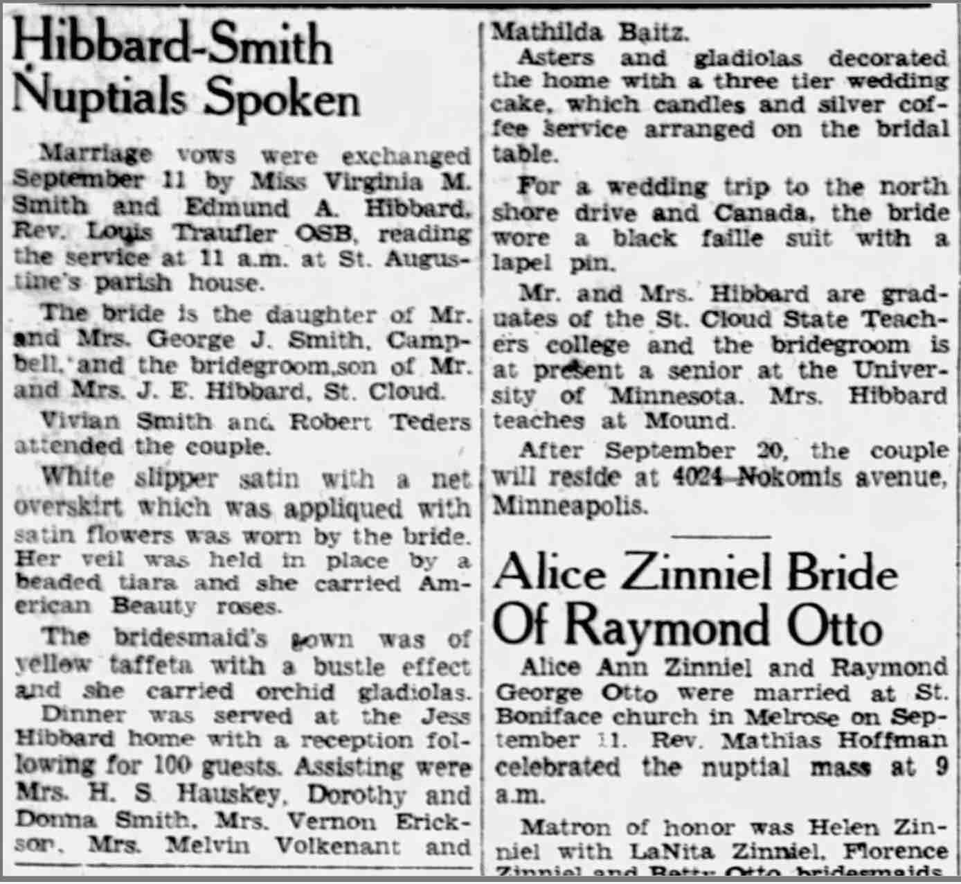 Marriage vows were exchanged September 11 by Miss Virginia M. Smith and Edmund A. Hibbard, Rev. Louis Traufler OSB, reading the service at 11 a.m. at St. Augustine’s parish house.